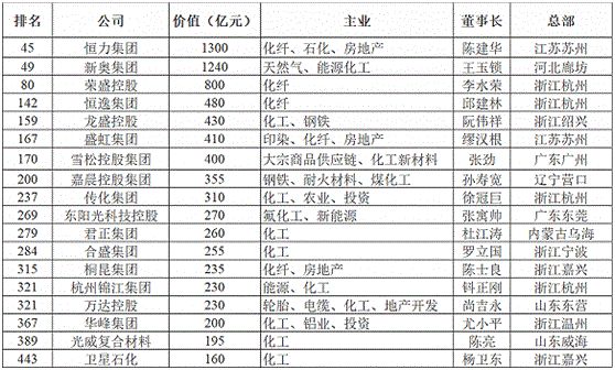 در بین 500 شرکت خصوصی برتر در چین ، 18 شرکت مرتبط با مواد شیمیایی قرار دارند که گروه هانگلی بالاترین رتبه را دارد. در جایگاه دوم گروه enn ، به ارزش 124 میلیارد یوان قرار گرفت. در جایگاه سوم منابع rongsheng ، با ارزش 80 میلیارد یوان است.